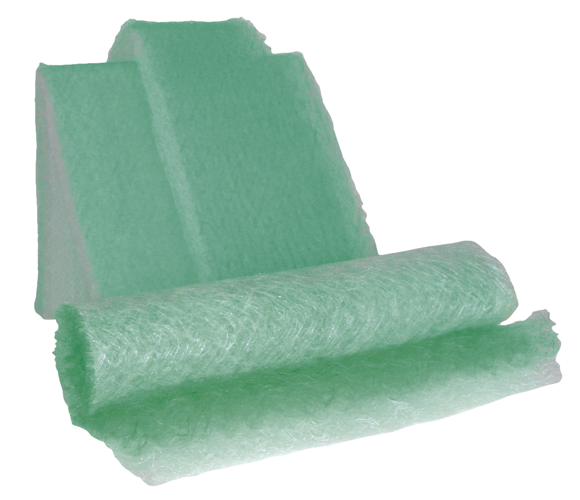 Hochwertiges Glasfasergelege / weiß-grün, verdichtete Reinluftseite, zur Farbnebelabscheidung, in verschiedenen Stärken 50 mm, 75 mm, 100 mm, unbrennbar nach DIN 4102, Silikonfrei, Acetonbeständig, in Rollenware oder Zuschnitten nach Ihren Angaben.
